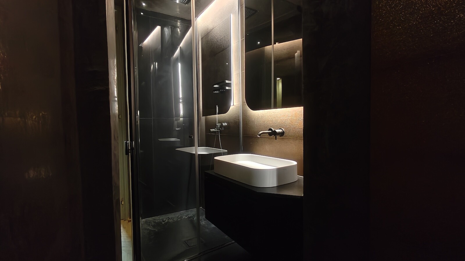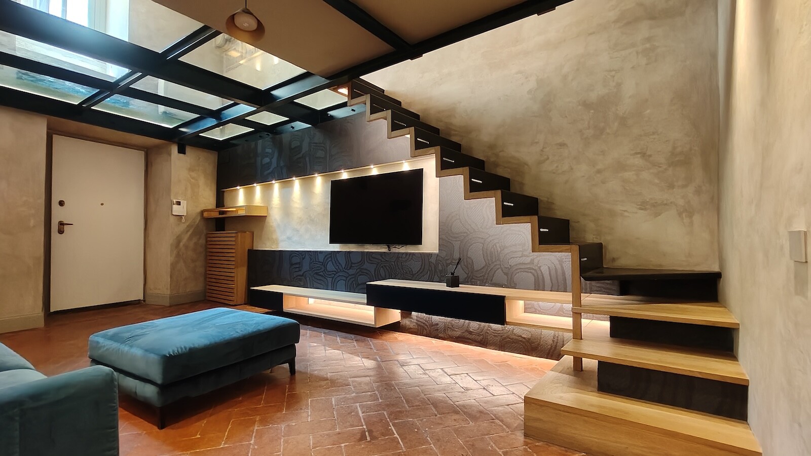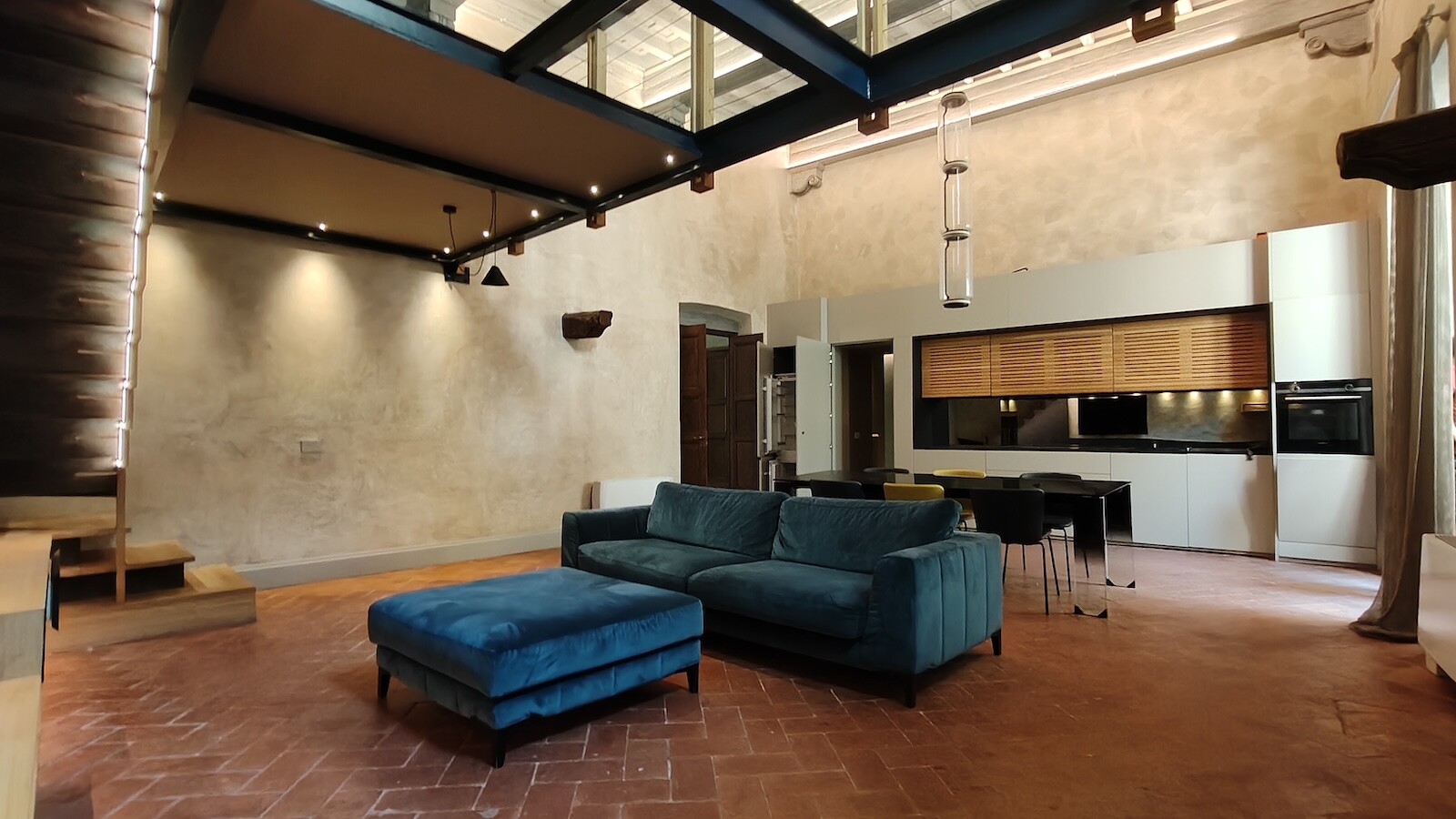 L’abitazione accoglie con un ampio e luminoso soggiorno impreziosito da un’elegante cucina a vista e da un raffinato soppalco in vetro, elemento di design che conferisce leggerezza e modernità agli spazi.